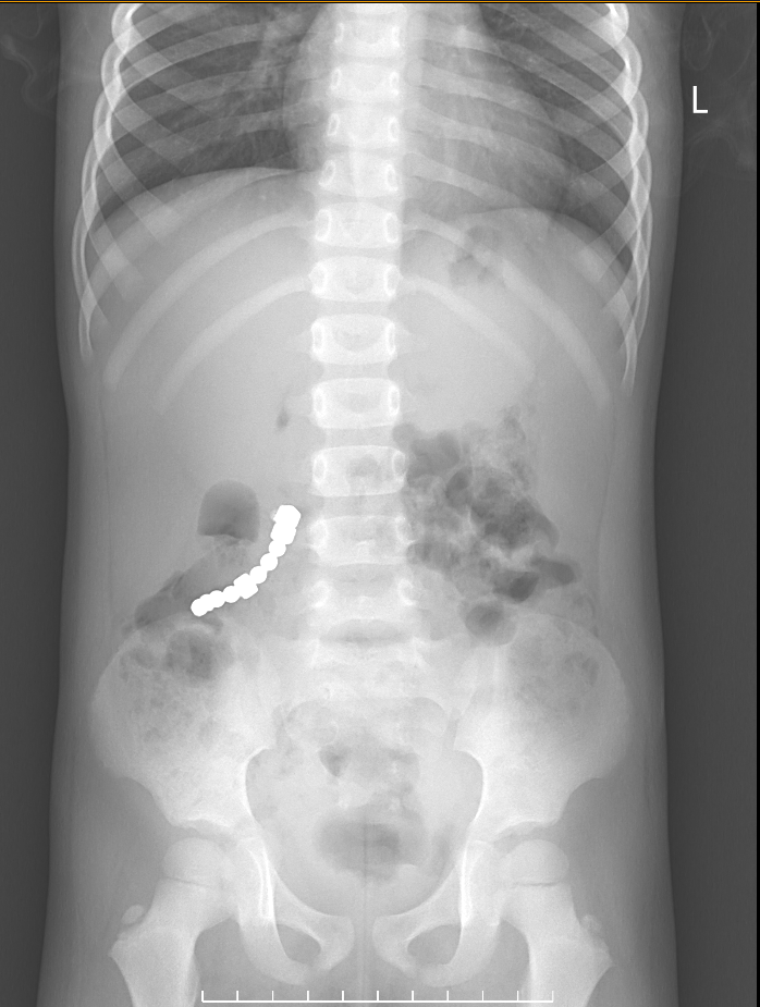 Sau khi khai thác bệnh sử và tiến hành các xét nghiệm cần thiết, các bác sĩ chẩn đoán bé bị dị vật nam châm trong hệ tiêu hóa. Tình trạng của bé vô cùng nguy hiểm bởi nếu không được can thiệp kịp thời, hai thanh nam châm có thể kẹt lại với nhau ở các vị trí khác nhau của ruột, gây tắc ruột, thậm chí là thủng ruột, ảnh hưởng nghiêm trọng đến sức khỏe của bé.
