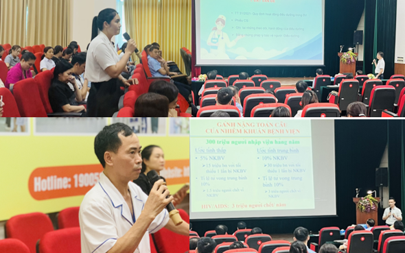 Hội nghị cũng được lắng nghe đ/c Nguyễn Văn Dũng – TP Điều dưỡng bệnh viện đa khoa tỉnh chia sẻ tham luận về Nghiên cứu cải tiến, áp dụng mẫu biểu phiếu theo dõi, chăm sóc người bệnh theo Thông tư số 32/2023/TT-BYT và đ/c Lê Nho Khuê – TK KSNK Bệnh viện Sản – Nhi trao đổi về Cập nhật triển khai các quy định về Kiểm soát nhiễm khuẩn tại cơ sở y tế. Các thành viên tham gia Hội nghị cũng thảo luận rất tích cực, sôi nổi.