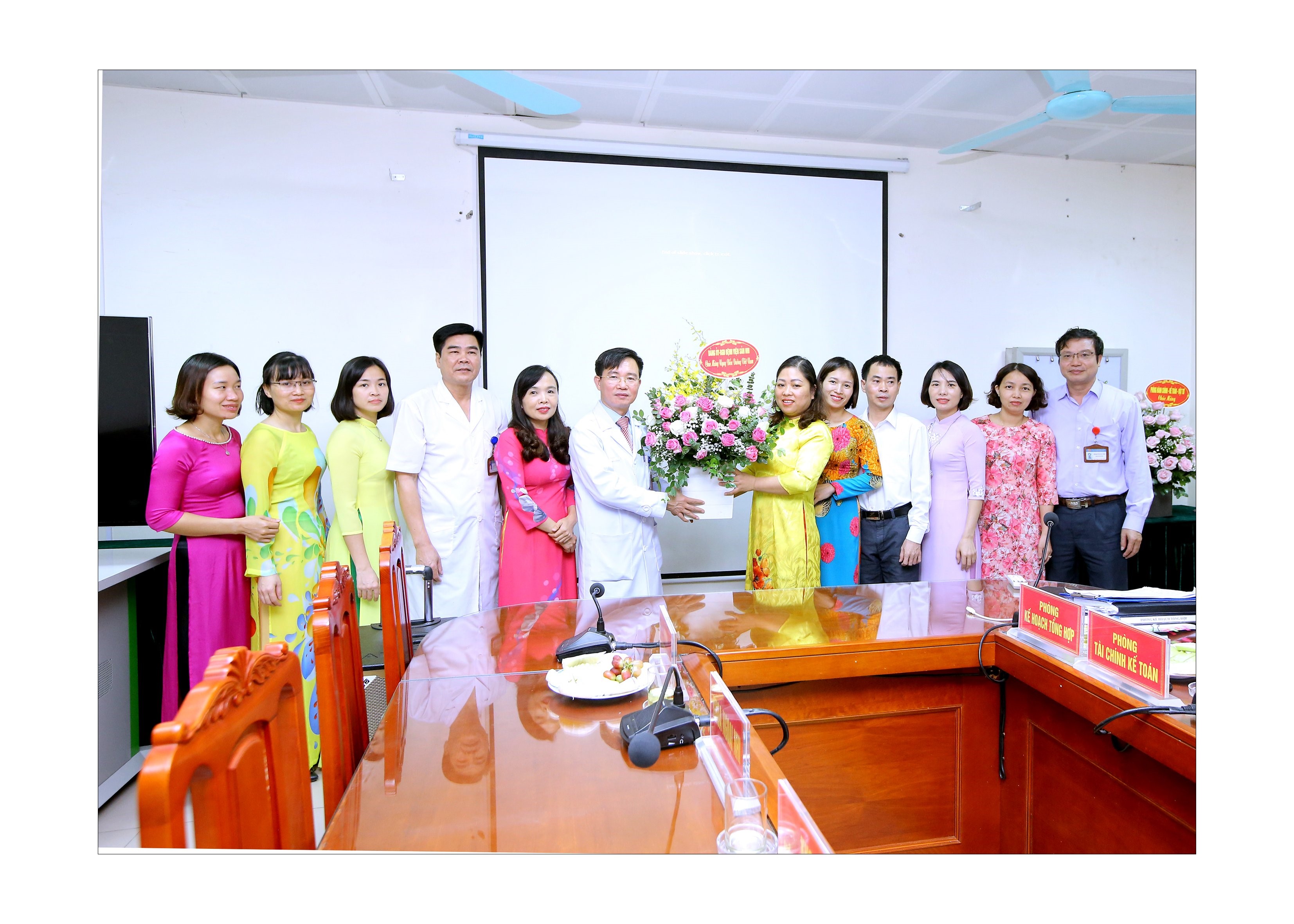 Đại diện chi hội Điều dưỡng đón nhận bó hoa tươi thắm của Đảng ủy, Ban giám đốc bệnh viện