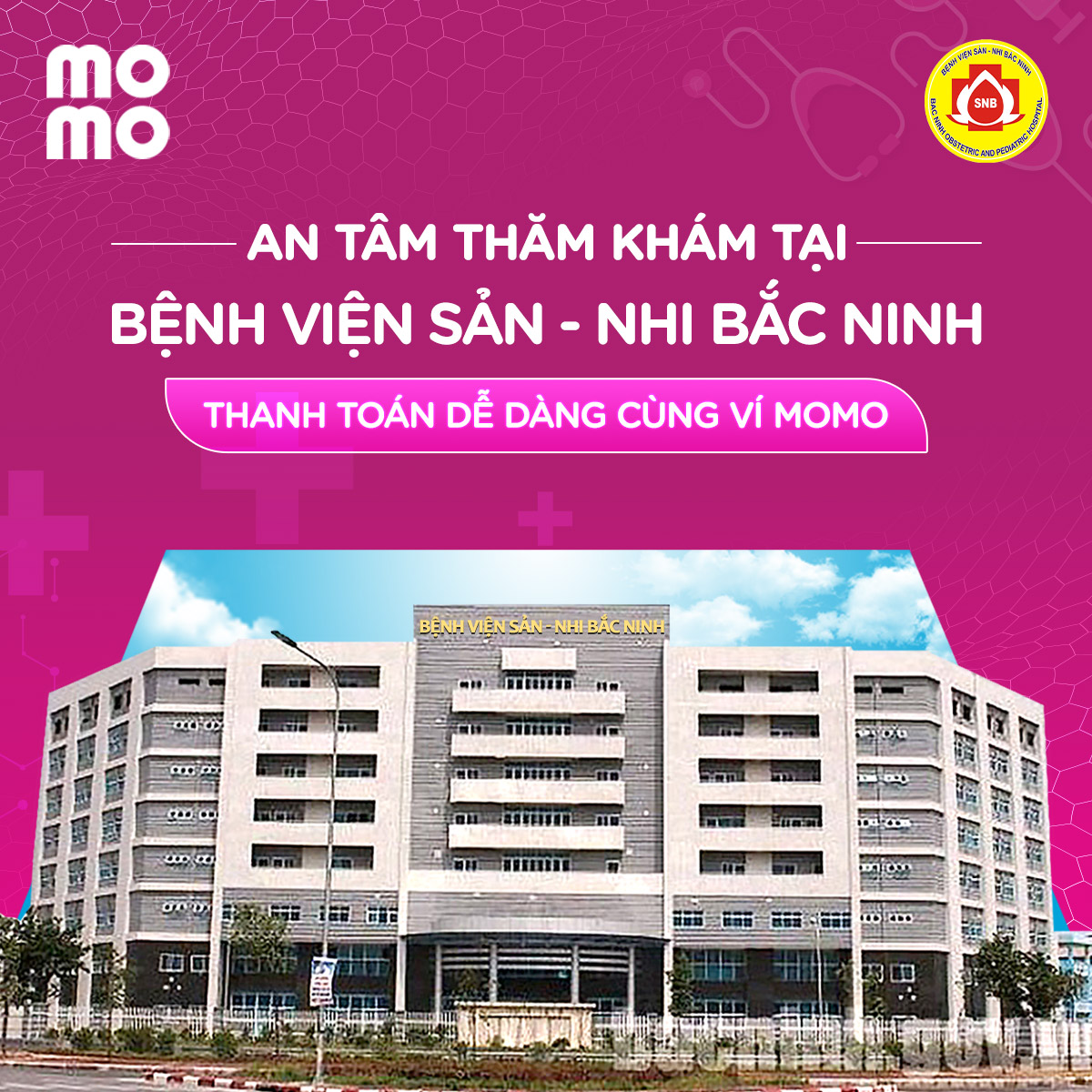 Sau hơn 4 năm xây dựng và phát triển, Bệnh viện Sản Nhi tỉnh Bắc Ninh được Ủy ban nhân dân tỉnh Bắc Ninh xếp hạng bệnh viện chuyên khoa tuyến tỉnh hạng I chuyên ngành Sản phụ khoa và Nhi khoa với 500 giường bệnh kế hoạch và 24 khoa/phòng/đơn nguyên. Theo đó, chỉ với vài nút chạm trên ứng dụng MoMo, bạn và người nhà có thể trải nghiệm thanh toán không tiền mặt an toàn – tiện lợi khi đến thăm khám tại Bệnh viện Sản Nhi tỉnh Bắc Ninh, không phải lo lắng vì mất thời gian xếp hàng chờ thanh toán. Mọi viện phí chỉ cần mở Ví MoMo là thanh toán ngay.